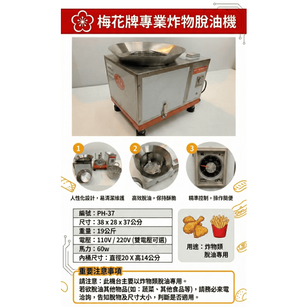 編號:PH-37 尺寸:38 x 28 x 37公分 重量:19公斤 電壓:110V / 220V 馬力:60w 內桶尺寸:直徑20 X 高14公分 用途:炸物類 脫油專用 請注意:此機台主要以炸物類脫油專用 *若欲脫油其他物品請來電洽詢,告知脫物及尺寸大小,判斷是否適用